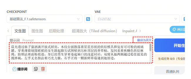 Segment Anything Model:用户能够通过单击图像中的对象进行剪切,生成一套 AI 能轻松理解的提醒词。点击左上角的【翻译为英文】。烘焙厨房细节、场景空气、画面构图等,气概活跃清爽,由于里面有海量抢手设想气概可选。