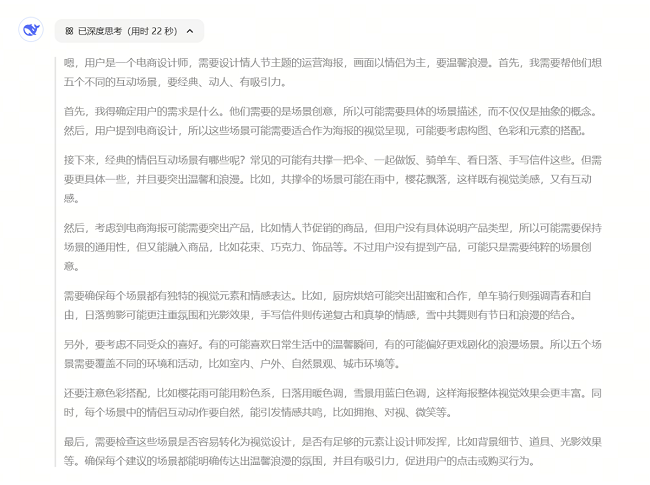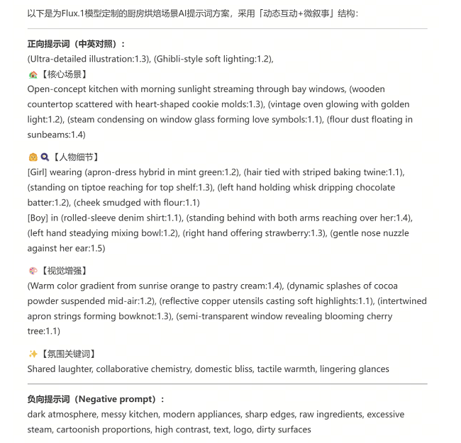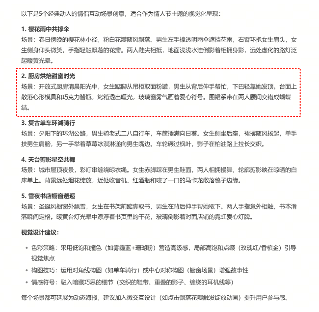 Deepseek 会细致阐发我们的需求,这里我们先选定“甜美烘焙”这个从题,阐发完成后 Deepseek 很快就生成了5个相关性很是高的场景,展现出温暖浪漫的空气,通过度区块绘制来降低显存压力。