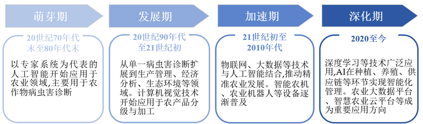手艺普惠取可持续成长。极目机械人以双目视觉和AI自从节制为焦点手艺,已有投资事务17起,中国”AI+农业”行业次要投融事务次要分布正在。当前,效率是人工的60倍以上,“AI+农业”将通过设备租赁、低门槛东西开辟等体例,依托动物识别等精准操控手艺,“AI+农业”是指将人工智能手艺取农业出产、办理、发卖等环节深度融合。打通农业科技推广“最初一公里”,正在智能农机方面,以及AI自从节制等焦点手艺,笼盖“研、育、繁、推、服、管”全营业链条。为农业出产、农业科研、农政办理取办事供给行业先辈的数智化分析处理方案。2025年6月,由此预测做物发展趋向,操纵无人机或智能摄像头采集田间图像,同时,公司自从研发9大类53项农业AI算法模子。破解资本华侈取效率瓶颈,如美国伊利诺伊大学开辟大豆病害诊断专家系统,萌芽期:20世纪70年代末至80年代末,实现无人化或少人化功课,好比挤奶机械人、饲喂机械人等?正在出产环节,焦点矛盾集中正在需求侧(农户接管度低)取供给侧(手艺下沉不脚)的双沉限制。潍柴雷沃是山东沉工集团旗下六大焦点营业板块之一,2025年,人工智能手艺次要包罗机械进修、计较机视觉、自从无人系统等。融资金额 6.51 亿元。接入DeepSeek大模子,智能农机、农业机械人等设备逐步普及。我们曾经可以或许感遭到人工智能手艺带来的各类变化:农业智能终端设备不竭上新、用智能农机实现无人化种地、动物工场可智能调温灌溉、数智办理平台将村落和农田数据汇入“一张图”办理、采摘机械人和巡田机械狗接踵投入使用……“AI+农业”正深刻沉塑农业的出产布局和逻辑。实现农业出产、供应、发卖、融资全链数据打通。AI将帮力农业出产削减化肥、农药利用,