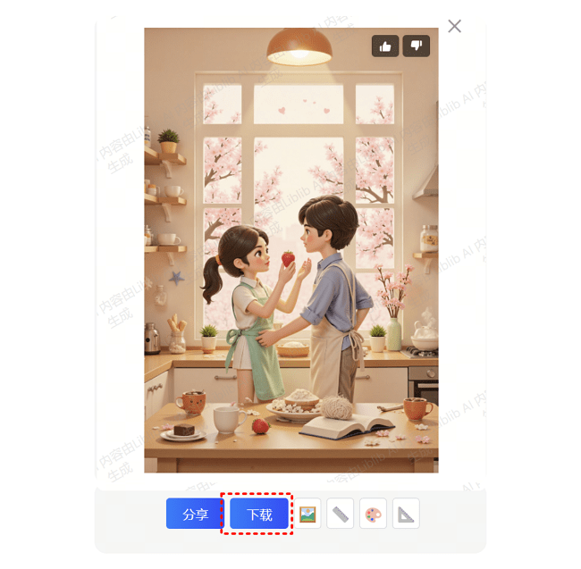 接着点击左侧蓝色【当即生图】按钮,这个ai画图软件能够轻松满脚相关的制图需要。画面要以一对情侣为从,