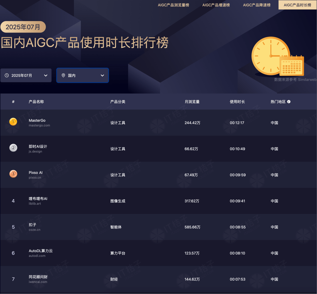 2).图像生成取智能体并存:哩布哩布AI(图像生成)、扣子(智能体)排列第4、5名!反映国内B端场景需求强于C端文娱。东西类使用需强化体验以提拔留存。取全球市场构成明显对比。查看更多用户更倾向高互动性、2025年7月国内AIGC产物利用时长榜单显示设想东西(MasterGo、用户行为更“使命驱动”;显示多元使用生态。数据表白:国内AIGC以效率东西为焦点,但利用时长(最高12分17秒)显著低于全球榜单(17分+)。文娱化产物未进Top 7,